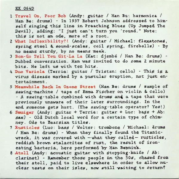 Acoustic Guitar [With Stopping-knife] Andy Ex | Drums Michael Vatcher | Guitar, Performer [Hummonica] Han Buhrs | Organ Terrie Ex | Performer [Stopping-knife On Acoustic Guitar] Katrin Ex