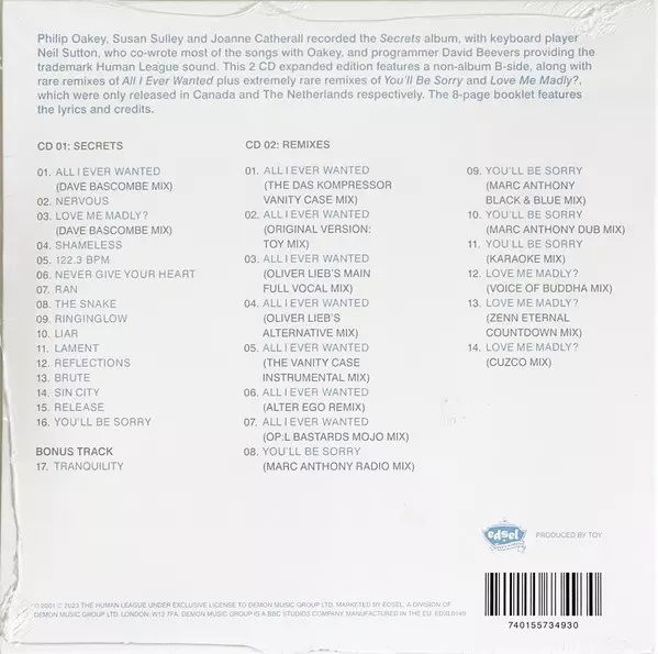 The Human League: Secrets DLX versie op 2CD in deluxe editie. Deze specifieke uitgave werd uitgebracht in Europa bij uitgeverij Edsel Records op 1. september 2023. Album valt binnen het genre Elektronische muziek en Synth-Pop.