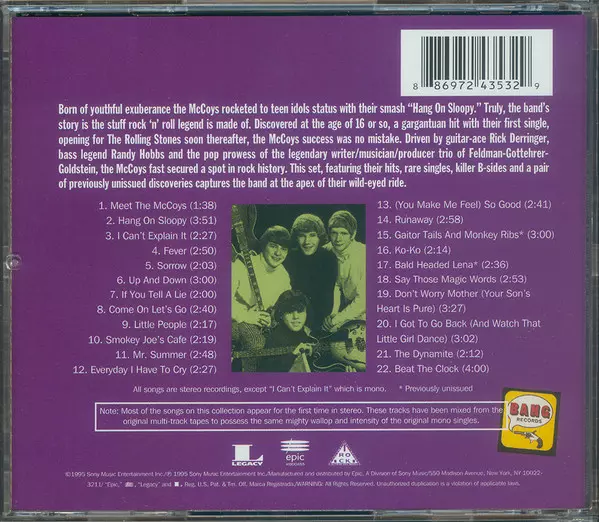 The McCoys: Hang On Sloopy: The Best Of The McCoys versie op CD in remastered editie. Deze specifieke uitgave werd uitgebracht in VS bij uitgeverij Legacy in samenwerking met Epic Associated op 1. september 2014. Album valt binnen het genre Rock, Pop Rock en Classic Rock.