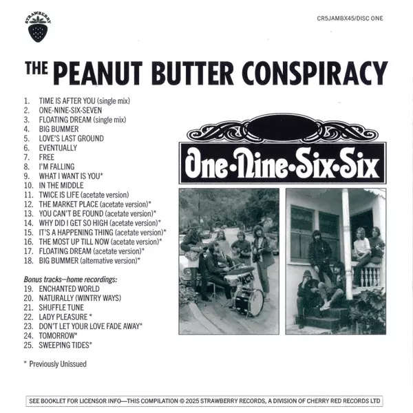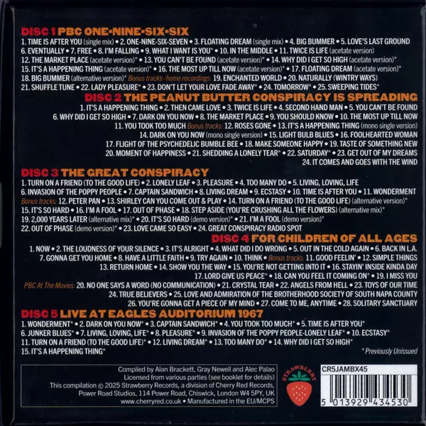 The Peanut Butter Conspiracy: The Most Up Till Now - A History 1966-1970 versie op 5CD in remastered editie. Deze specifieke uitgave werd uitgebracht in Verenigd Koninkrijk bij uitgeverij Strawberry (26) op 8. augustus 2025. Album valt binnen het genre Rock, Pop, Folk, World, & Country, Folk Rock en Psychedelic rock. 5CD Clamshell Box.