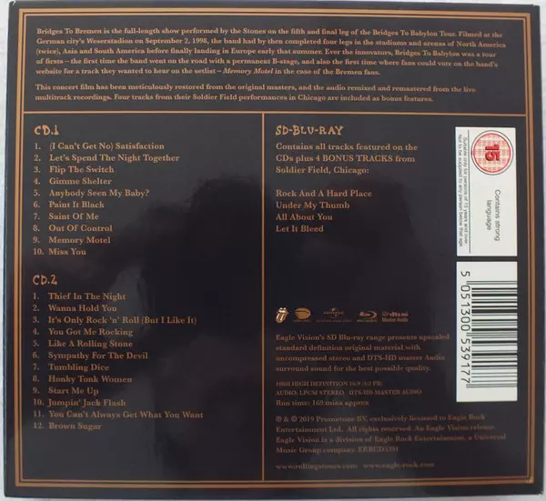 Bridges To Bremen is a full-length show performed by the Stones on the fifth and final leg of the Bridges To Babylon Tour while in Germany in September 1998. This concert has been meticulously restored from the original masters, and the audio remixed and remastered from the live multitrack recordings.