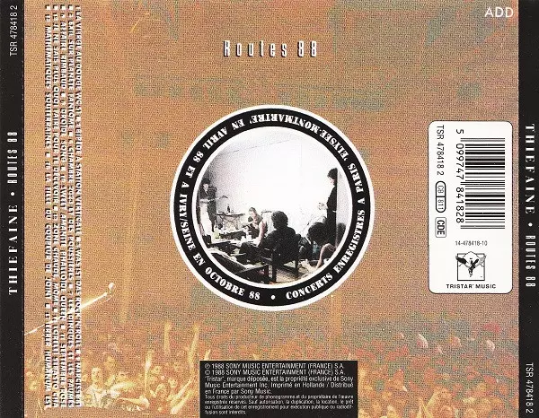 Hubert Félix Thiéfaine: Routes 88 versie op CD in standaard editie. Deze specifieke uitgave werd uitgebracht in Frankrijk bij uitgeverij Tristar Music op 3. februari 1995. Album valt binnen het genre Rock, Elektronische muziek, Alternative rock en Synth-Pop. Live.