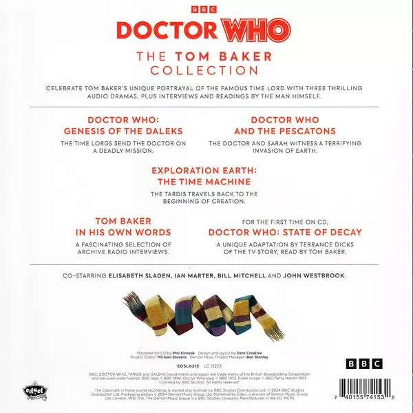Tom Baker: Doctor Who - The Tom Baker Collection versie op 4CD in standaard editie. Deze specifieke uitgave werd uitgebracht in Verenigd Koninkrijk bij uitgeverij Edsel Records op 27. september 2024. Album kan worden geclassificeerd als genre Stage & Screen.