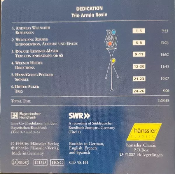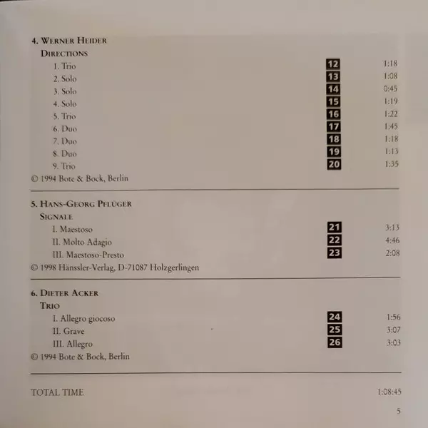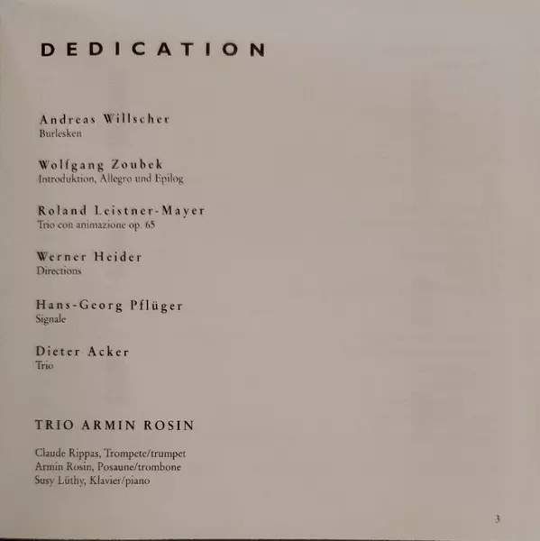 | Artiest | Andreas Willscher | Dieter Acker | Roland Leistner-Mayer | Hans Georg Pflüger | Trio Armin Rosin | Wolfgang Zoubek |