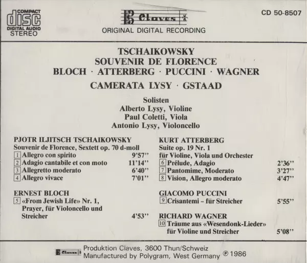 | Artiest | Pyotr Ilyich Tchaikovsky | Giacomo Puccini | Richard Wagner | Ernest Bloch | Kurt Atterberg | Camerata Lysy Gstaad |