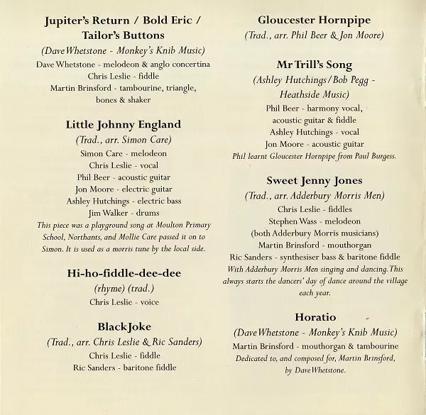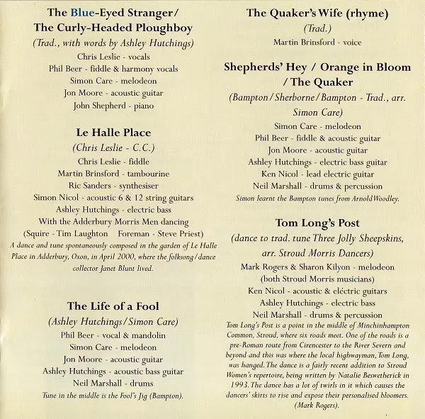 Acoustic Guitar [6 String], Twelve-String Guitar Simon Nicol | Electric Bass Ashley Hutchings | Fiddle, Written-By Chris Leslie | Performer [Dancing] Adderbury Village Morris Men | Synthesizer Ric Sanders | Tambourine Martin Brinsford