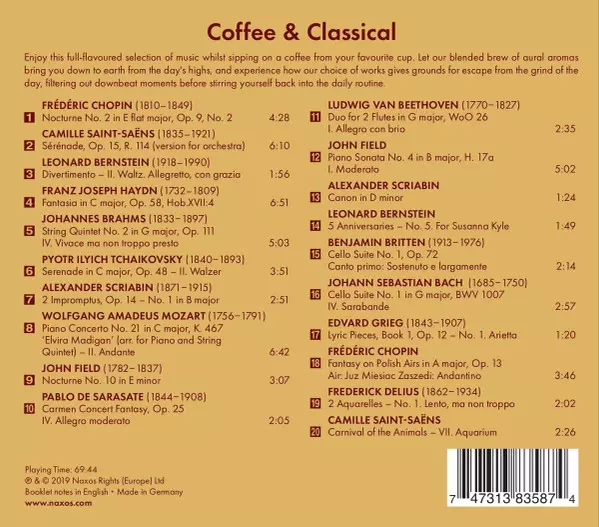 Various: Coffee & Classical versie op CD in standaard editie. Deze specifieke uitgave werd uitgebracht in Europa bij uitgeverij Naxos op 22. november 2019. Album valt binnen het genre Klassieke muziek, Barokmuziek, Modernism en Romance.