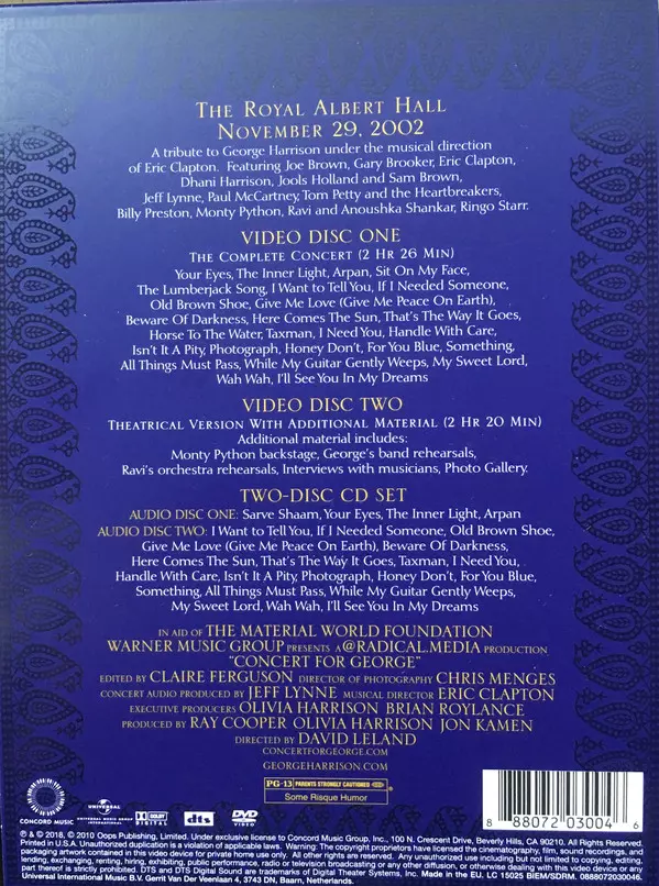 The legendary 'Concert for George' reissued in 2018 On 29 November 2002, the first anniversary of George Harrison's death, many colleagues and friends gathered on the stage of London's Royal Albert Hall to pay tribute to the musical legend. This live recording, 'Concert For George', was first released in 2003. In 2018, it was re-released in a va...