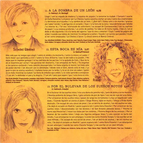 | Arranged By, Directed By [Arregos Y Dirección] David San José | Bass Javier Saiz | Cello Joaquim Alabau | Drums Angel Crespo | Piano David San José | Violin, Viola Pere Bardagí | Vocals Sole Giménez | Written-By Joaquín Sabina, Josep Maria Bardagí | |||