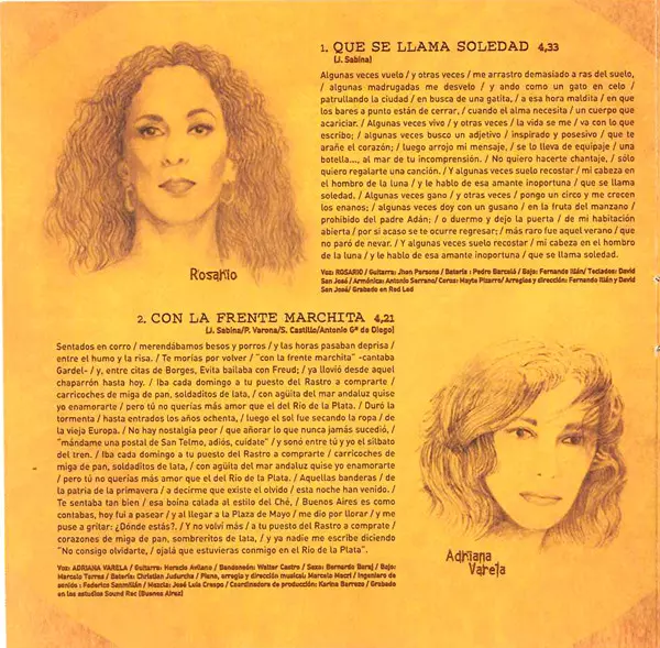 | Bandoneon Walter Castro | Bass Marcelo Torres | Coordinator [Coordinadora De Producción] Karina Barrezo | Drums Cristian Judurcha | Engineer Federico Sanmillán | Guitar Horacio Avilano | Mixed By José Luis Crespo | Piano, Arranged By, Directed By [Dirección Musical] Marcelo Macri | Saxophone Bernardo Baraj | Vocals Adriana Varela | Written-By Antonio García De Diego, Joaquín Sabina, Pancho Varona, Sergio Castillo | |||