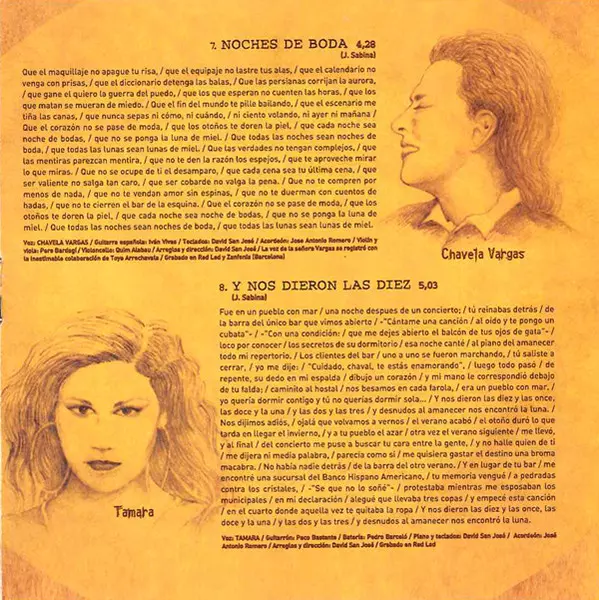 | Accordion Jose Antonio Romero | Arranged By, Directed By [Arreglos Y Dirección] David San José | Drums Pedro Barceló | Guitarrón Paco Bastante | Piano, Keyboards David San José | Vocals Tamara (7) | Written-By Joaquín Sabina | |||