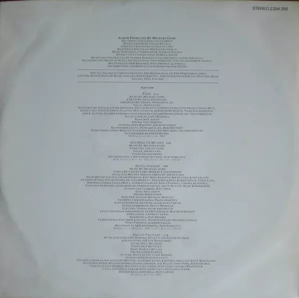 Arranged By, Piano Steve Margoshes | Bass Gene Santini | Bassoon Donald MacCourt, Loren Glickman | Cello Alla Goldberg, Carolyn Halif, Holly Singer, Lawrence Lenske, Maurice Bialkin, Richard Locker | Chorus Alan Vetter, Amy Wheeler, Annie Roboff, Anthony Evans, April Lang, Ben Werblolowsky, Cheryl Williams, Darryl Ware, Delphia Shipman, Denise Andrades, Derek Cheeley, Eric Brockington, Gordon Sayles, Jean Deetjin, Judith Charlton, Julie Cohen (2), Kevin Windley, Ladd Boris, Lance Gross, Leonard Battle, Lillian Miller, Linda Jefferson, Lisa Herman, Lisa Lowell, Luanne Holder, Monica Dizzoza, Nanette Dermanjian, Nanette Schwersenz, Ralph Dujour, Raul Lugo, Robert Bostwick, Robert Koch (3), Rodney Gray, Saundra Evans, Shirley Jiha, Traci Parnell, Wanda Tanks, Willie Henry Jr., Yvette Carrington | Clarinet Charles Russo, William Blount | Double Bass Donald Palma, John Beal, Lewis Paer, Ralph Oxman | Drums Allan Schwartzberg | Flute Andrew Lolya, Julius Baker, Phil Bodner | French Horn Al Richmond, Peter Gordon (8), Ron Sell, Sharon Moe | Guitar Billy Cross (2) | Lyrics By Michael Gore | Music By Dean Pitchford | Oboe George Marge, Marsha Heller | Percussion Gordon Gottlieb, James Ogden, Michael Levenson | Producer Michael Gore | Tambourine Anthony Evans, Darryl Ware, Delphia Shipman, Eric Brockington, Traci Parnell | Trombone David Taylor, Eddie Bert, Harry DiVito | Trumpet Danny Cahn, James Sedlar, Lew Soloff | Viola Carolyn Voight, Evelyn Glover, Harold Coletta, Helen C. Huybrechts, Seymour Berman, Sue Pray | Violin Alphonse Schipani, Arianne Bronne, Carmel Malin, Frederick Buldrini, Israel Chorberg, Jean Ingraham, Joe Malin, Joyce Flissler, Kathryn Kienke, Leo Kahn, Leon Goldstein, Leonore Walaniuk, Marilyn Wright, Max Hollander, Peter Dimitriades, Peter VanDerwater, Regis Iandiorio, Suzanne Ornstein |