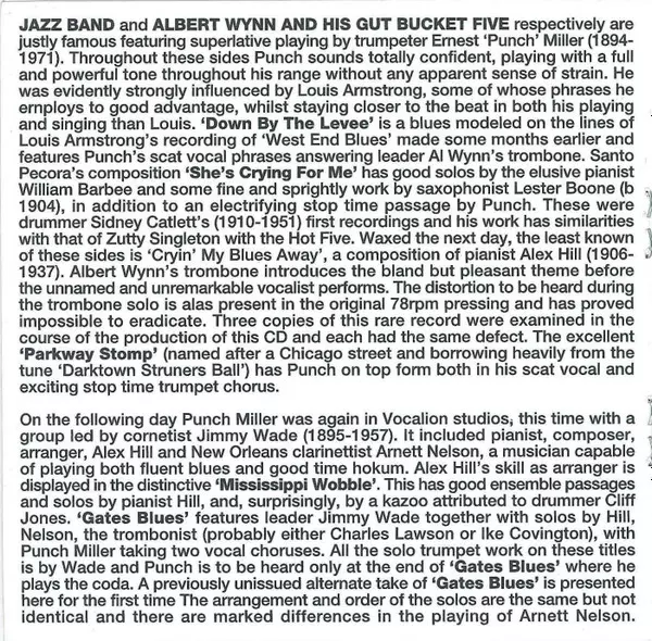 | Brass Bass Unknown Artist | Clarinet, Alto Saxophone, Tenor Saxophone [Possibly] Arnett Nelson, Charles Johnson (17) | Drums, Kazoo Clifford "Snags" Jones | Piano Alexander Hill | Trombone Charles Lawson (3) | Trumpet Jimmy Wade | Trumpet, Vocals Punch Miller | Written-By Jimmy Wade | |||