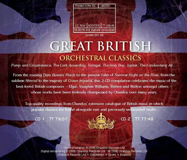 Various: Great British Orchestral Classics versie op 2CD in remastered editie. Deze specifieke uitgave werd uitgebracht in Verenigd Koninkrijk bij uitgeverij Chandos op 20. september 2005. Album valt binnen het genre Klassieke muziek en Modernism.