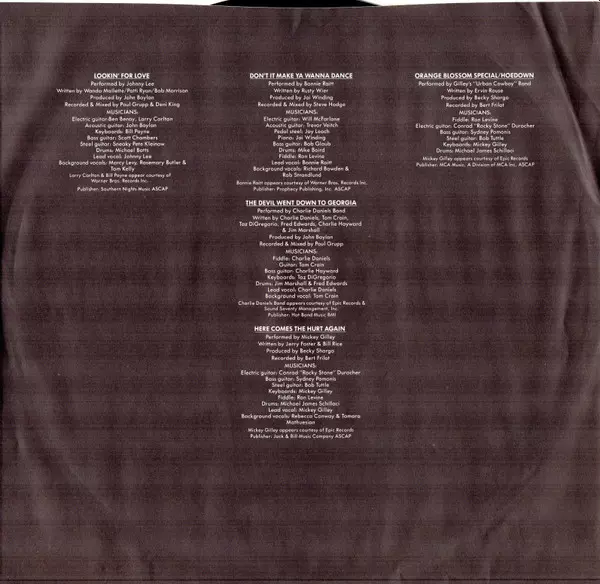 | Backing Vocals Rebecca Conway, Tamara Mathuesian | Bass Guitar Sydney Pomonis | Drums Michael James Schillaci | Electric Guitar conrad durocher | Fiddle Ron Levine (2) | Keyboards Mickey Gilley | Lead Vocals Mickey Gilley | Producer Becky Shargo | Recorded By Bert Frilot | Steel Guitar Bob Tuttle | Written-By Bill Rice, Jerry Foster | |||