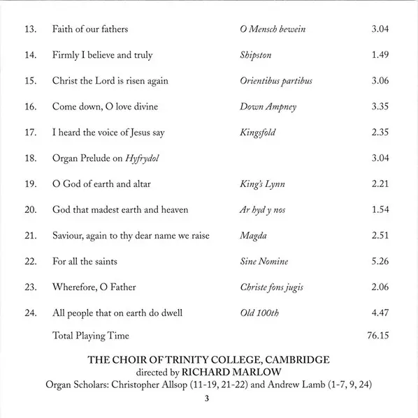 The Choir of Trinity College, Cambridge, is one of the most acclaimed collegiate choirs in the world, known for its distinctive sound and broad repertoire. The choir consists of around thirty choral scholars and two organ scholars, all of whom are undergraduates of the college. It ...