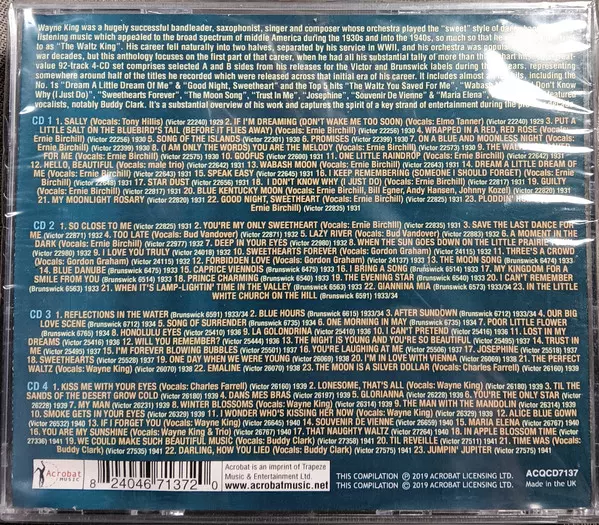 Wayne King And His Orchestra: The Wayne King Collection 1930-41 versie op 4CD in standaard editie. Deze specifieke uitgave werd uitgebracht in Verenigd Koninkrijk bij uitgeverij Acrobat op 9. augustus 2019. Album valt binnen het genre Pop, Jazz en Easy listening muziek.