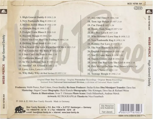 Webb Pierce: High Geared Daddy versie op CD in standaard editie. Deze specifieke uitgave werd uitgebracht in Duitsland bij uitgeverij Bear Family Records op 25. januari 2008. Album valt binnen het genre Rock, Folk, World, & Country, Hillbilly, Rockabilly en Honky Tonk.