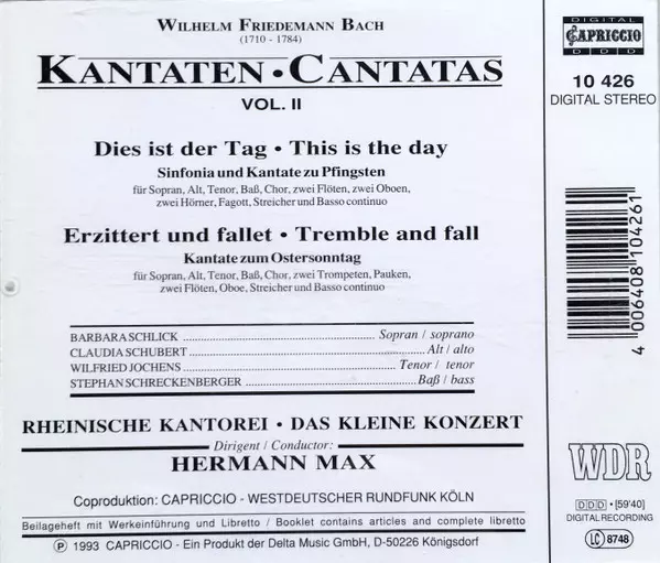| Artiest | Wilhelm Friedemann Bach | Barbara Schlick | Rheinische Kantorei | Das Kleine Konzert | Hermann Max | Stephan Schreckenberger | Wilfried Jochens | Claudia Schubert |