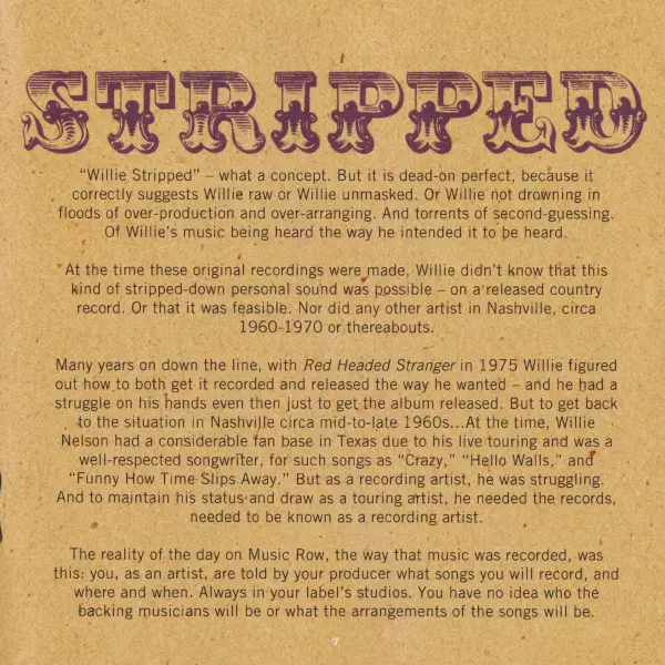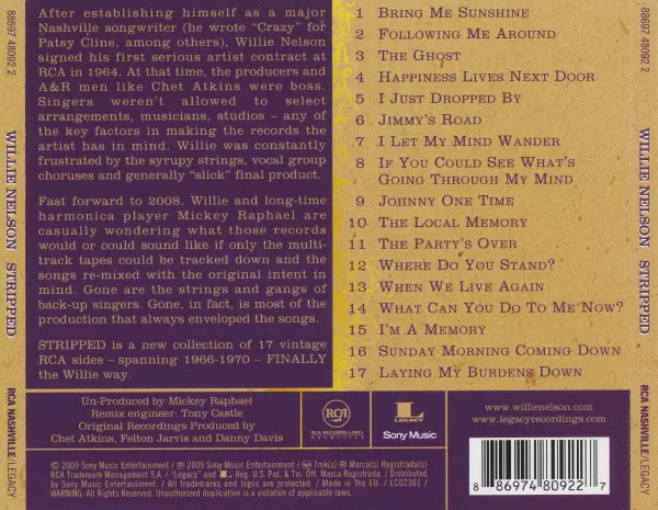 Willie Nelson: Willie Stripped versie op CD in standaard editie. Deze specifieke uitgave werd uitgebracht in Europa bij uitgeverij RCA Nashville in samenwerking met Legacy op 7. april 2009. Album valt binnen het genre Folk, World, & Country en Country.
