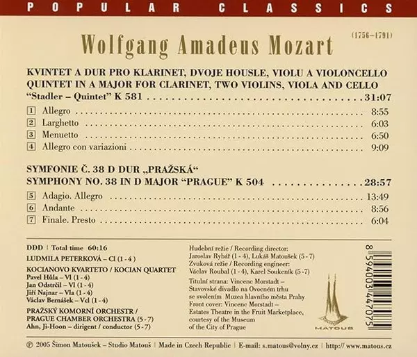 | Artiest | Wolfgang Amadeus Mozart | Prague Chamber Orchestra | Kocian Quartet | Ludmila Peterková | Ji-Hoon Ahn |