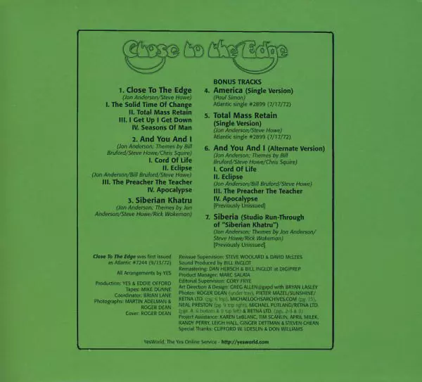 L. Brandt in Stereo Play 12/03: "One of the most fascinating albums in rock history. The remastering matches Rhino's excellence: very clean and clear without castrating the fabric, dynamic without digital excitement." P. Felkel in Musikexpress 3 / 04: "Close To The Edge" was the quintessence of British prog rock. In the title track, a suite of m...