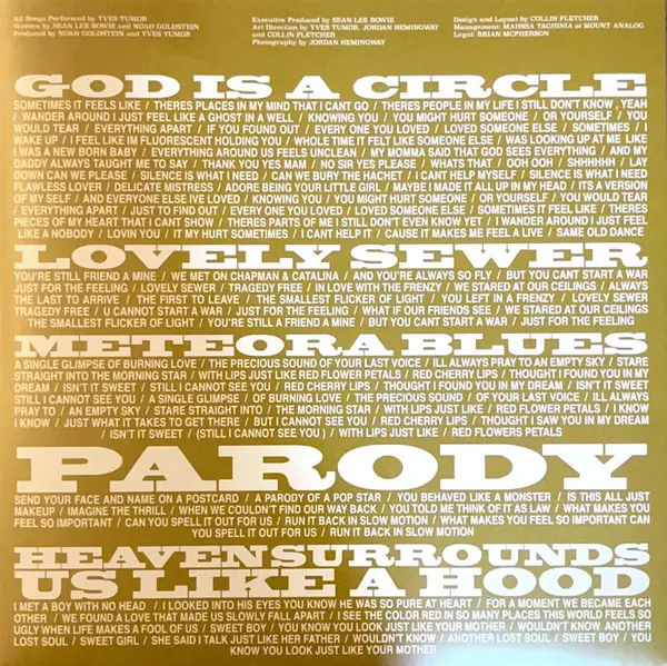 Bass Jake Miller (2), Sean Bowie | Drum Programming Elliott Kozel, Psymun | Drums Lemar Carter | Effects [FX] Elliott Kozel, Sean Bowie, Simon Christensen (3) | Guitar Chris Greatti, Elliott Kozel, Psymun | Mastered By Joe LaPorta | Mixed By Alan Moulder | Mixed By [Assisted By] Finn Howells, Tom Herbert (4) | Producer Elliott Kozel, Noah Goldstein, Psymun, Yves Tumor | Producer [Additional Production] Jake Miller (2) | Recorded By Jake Miller (2), Taylor Jackson (2) | Recorded By [Assisted By] Gabe Lowry, Jordan Cantor (2) | Vocals [Additional] Shannon Funchess | Written-By Elliott Kozel, Noah Goldstein, Sean Bowie, Simon Christensen (3)